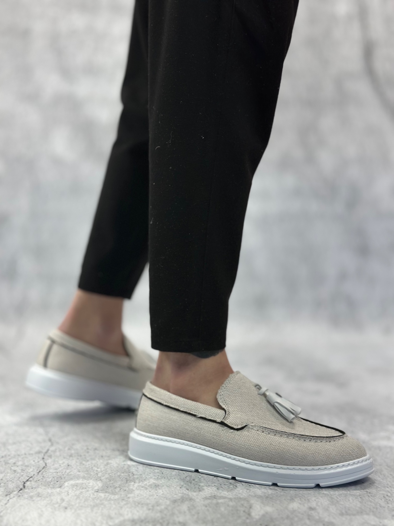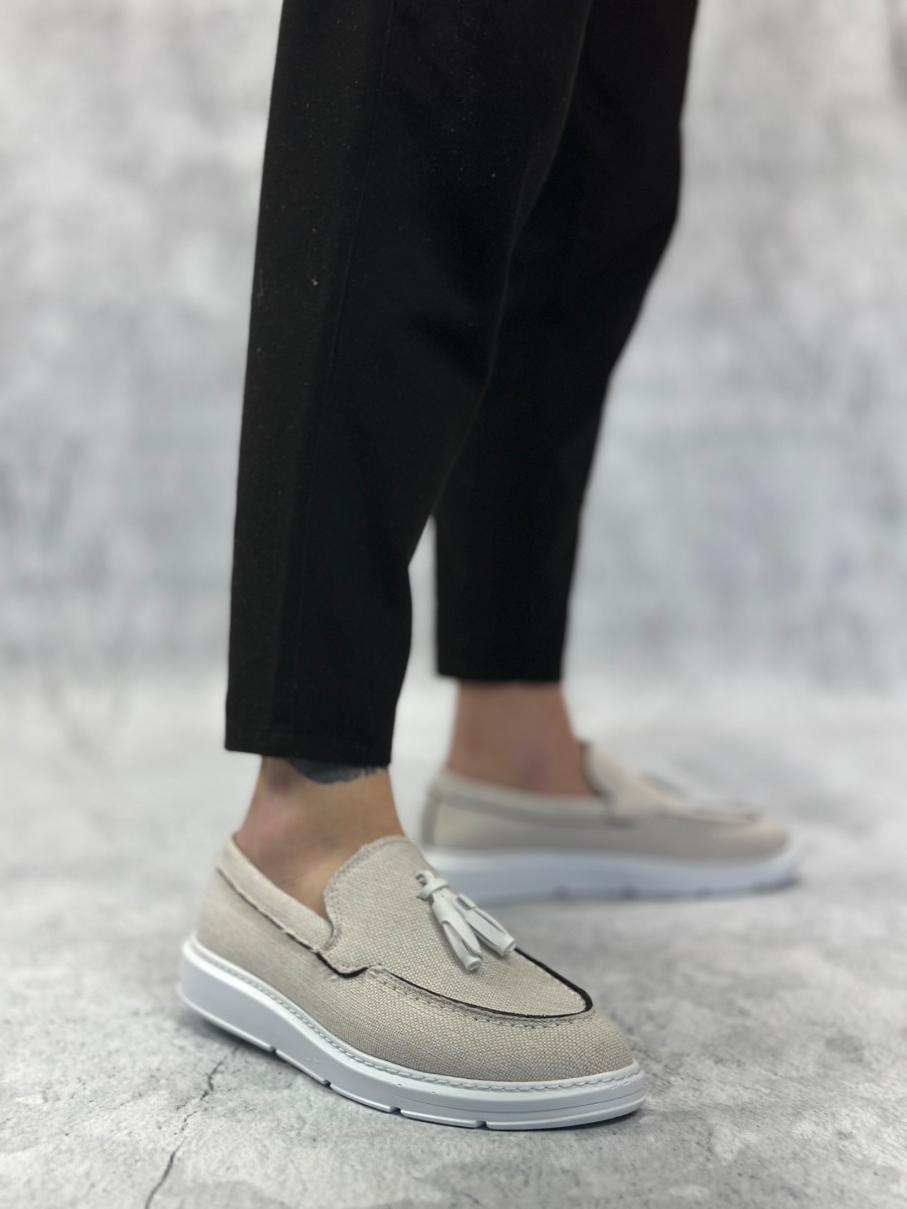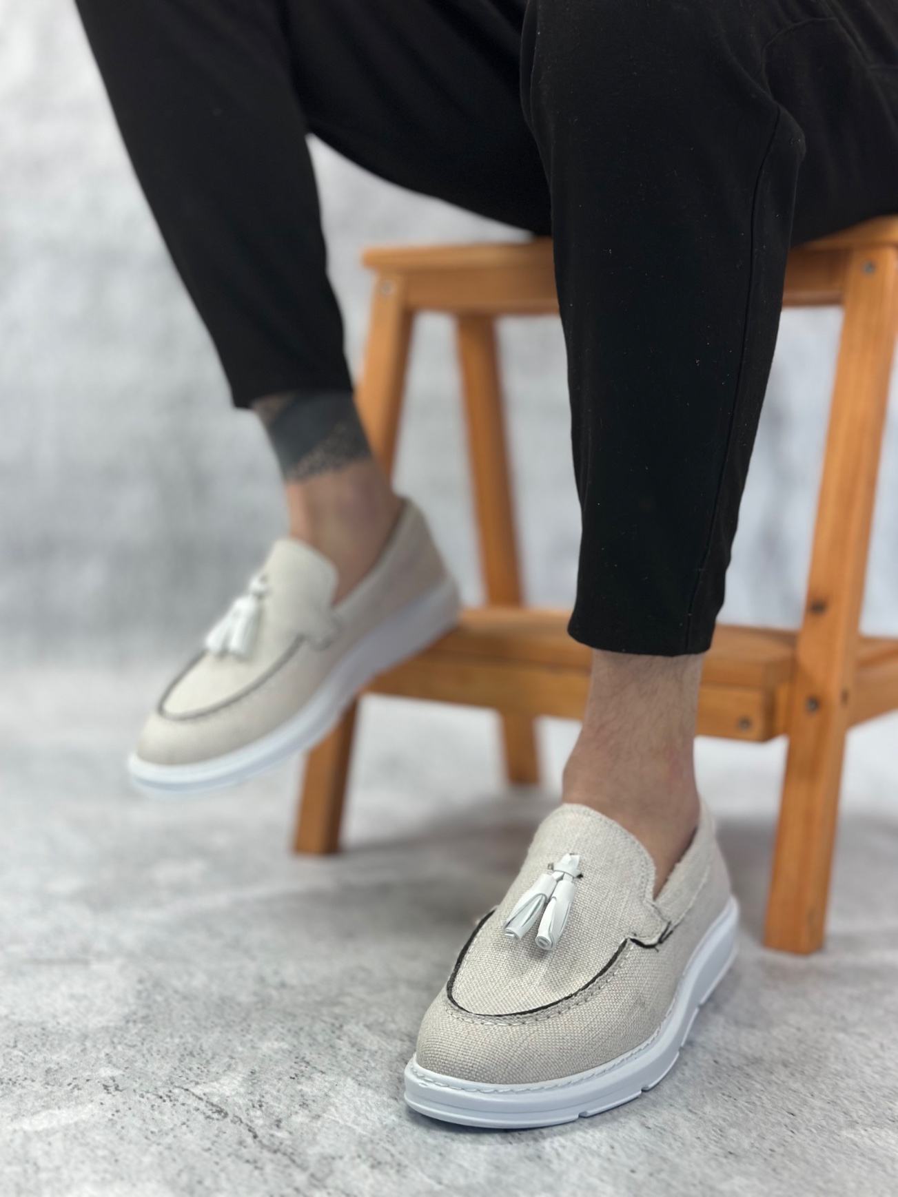 • BA0005 Bağcıksız Yüksek Taban Klasik Keten Beyaz Püsküllü Erkek Ayakkabı
