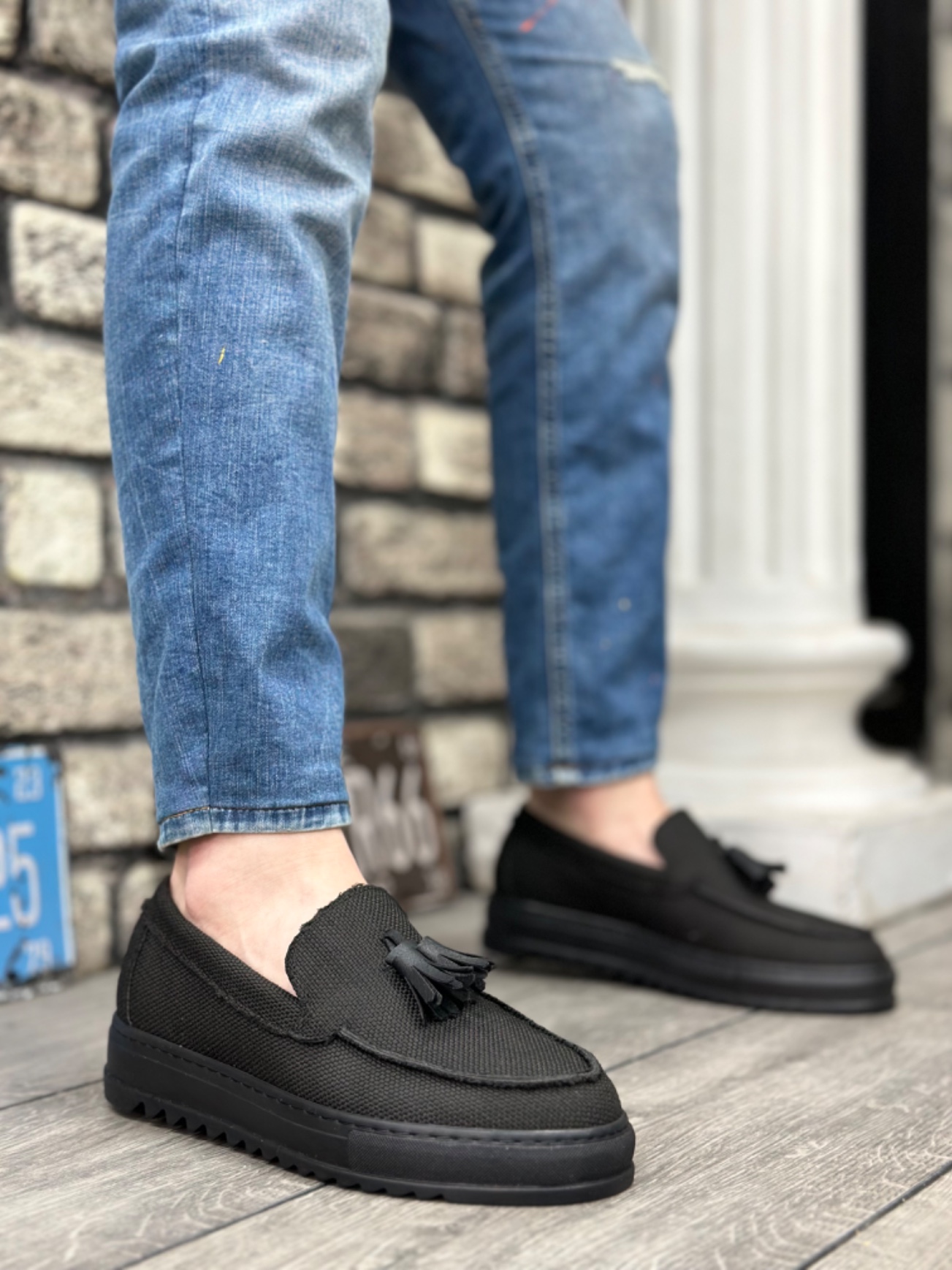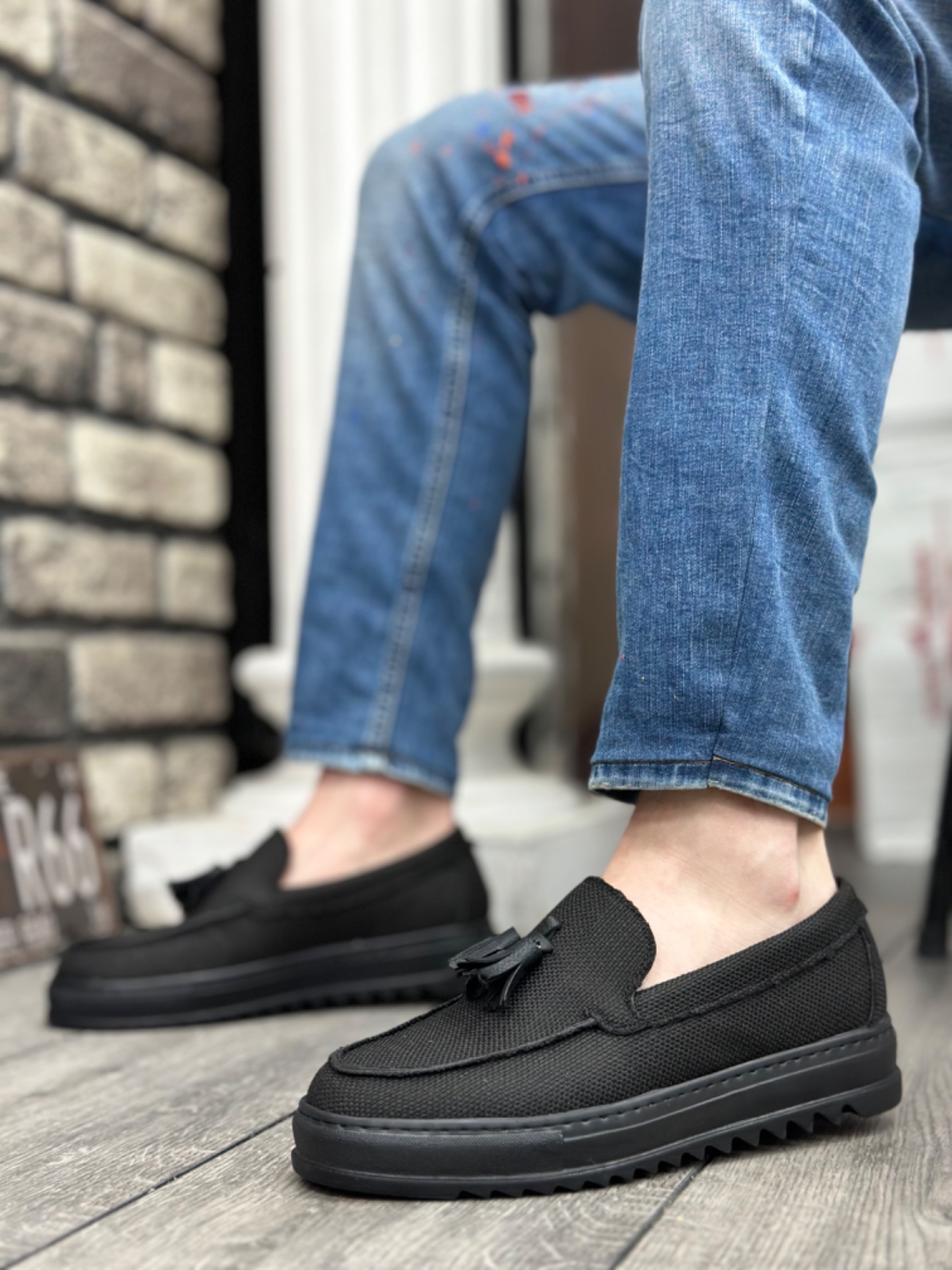 • BA0154 Bağcıksız Yüksek Taban Siyah Keten Siyah Taban Püsküllü Erkek Ayakkabı