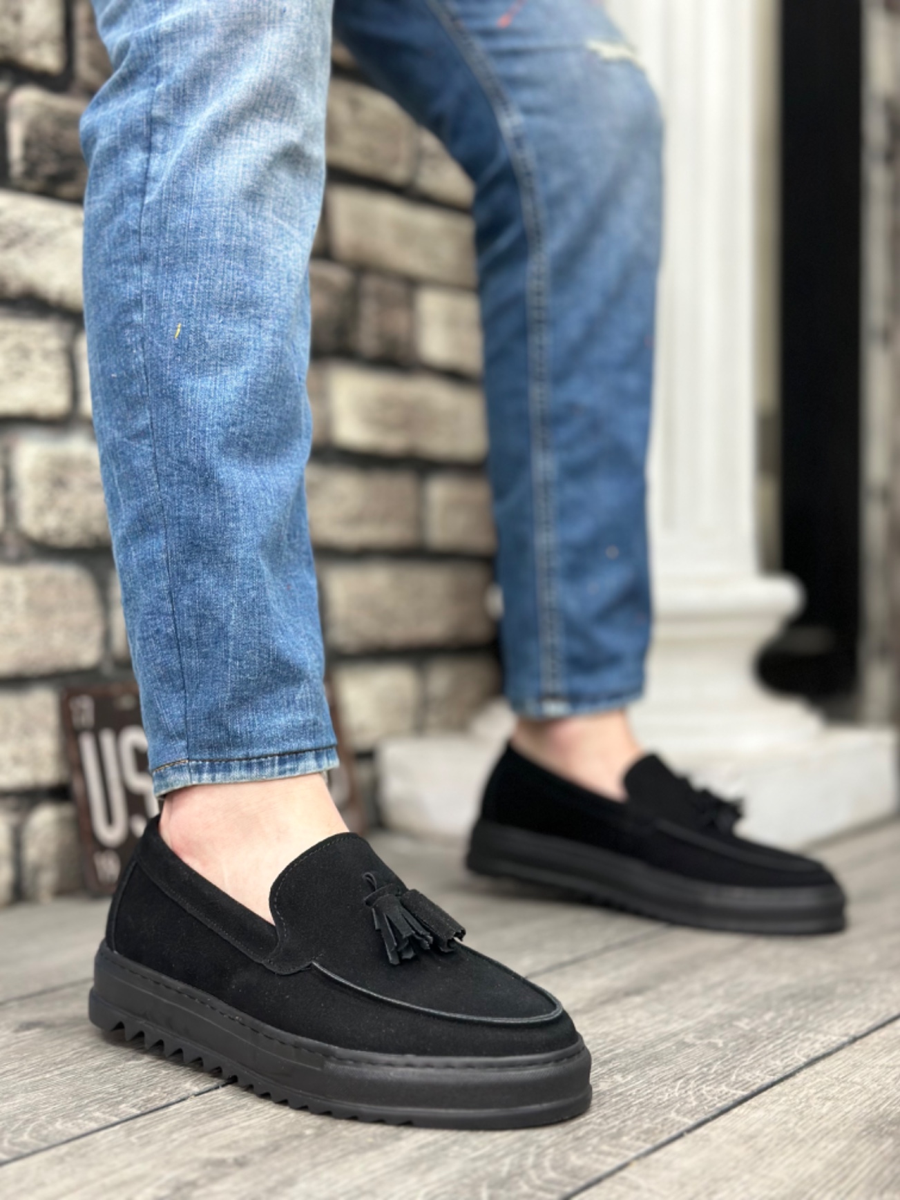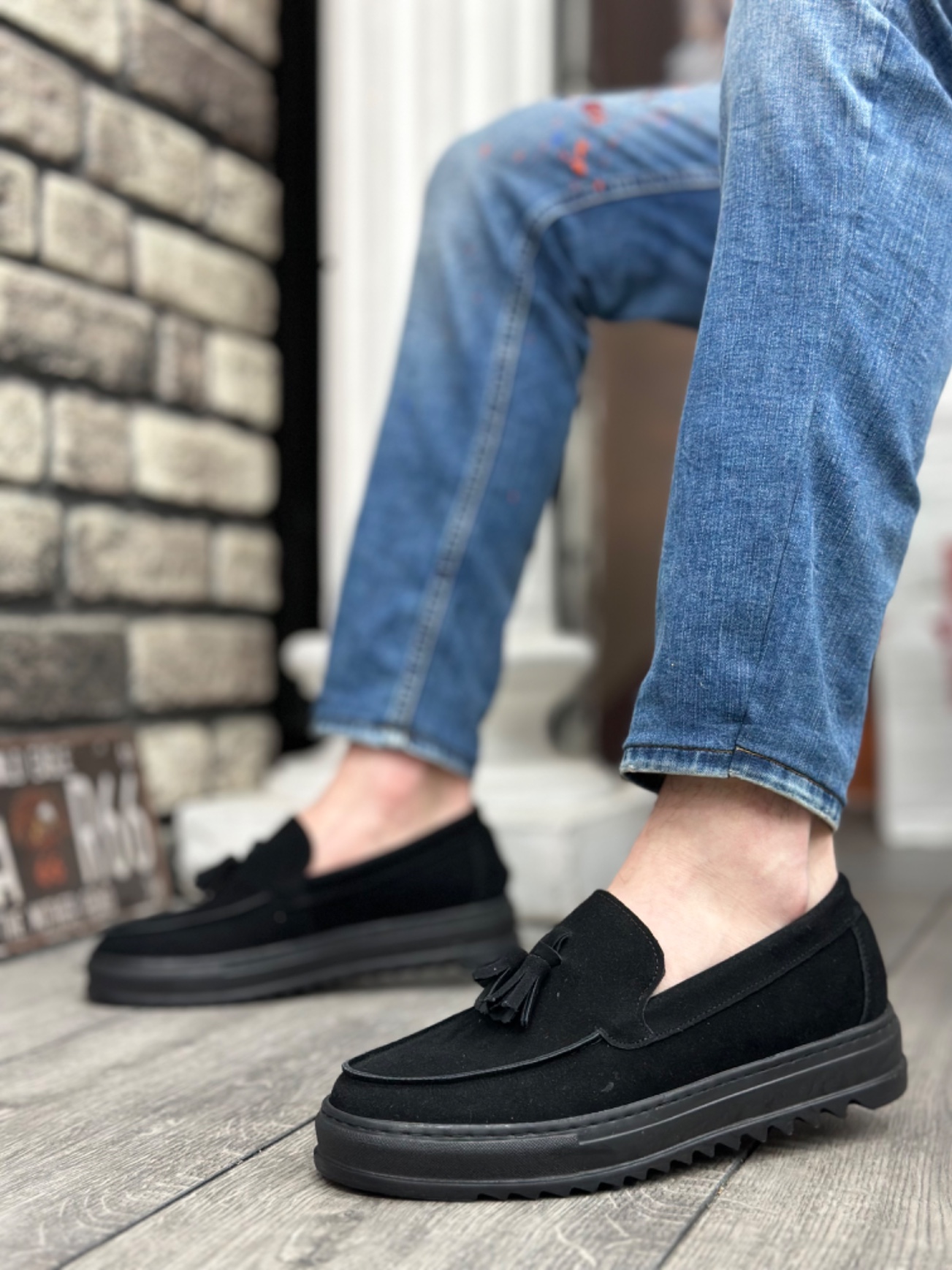 BA0154 Bağcıksız Yüksek Taban Süet Siyah Renk Siyah Taban Püsküllü Erkek Ayakkabı