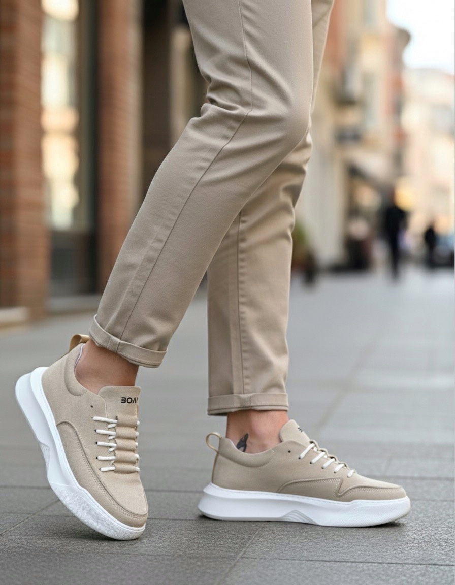 • BA0332 Merdiven Desen Bağcıklı Erkek Yüksek Taban Krem Süet Spor Ayakkabı