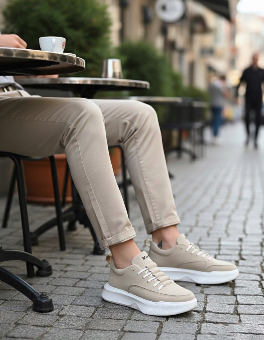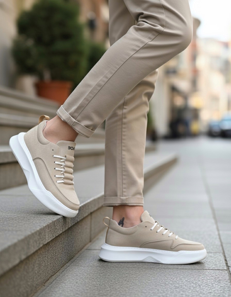 BA0332 Merdiven Desen Bağcıklı Erkek Yüksek Taban Krem Süet Spor Ayakkabı