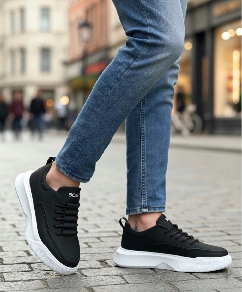 BA0332 Merdiven Desen Bağcıklı Erkek Yüksek Taban Siyah Cilt Beyaz Taban Spor Ayakkabı