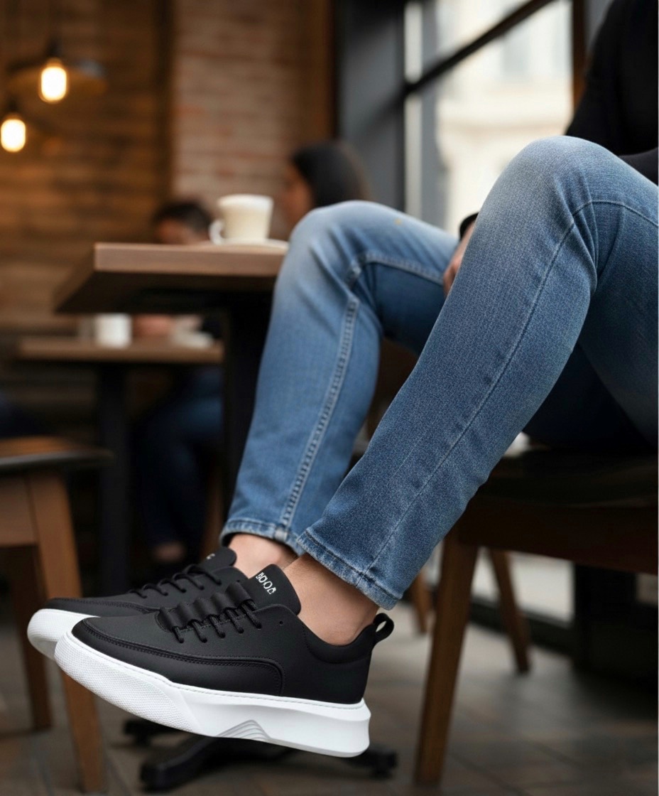 • BA0332 Merdiven Desen Bağcıklı Erkek Yüksek Taban Siyah Cilt Beyaz Taban Spor Ayakkabı