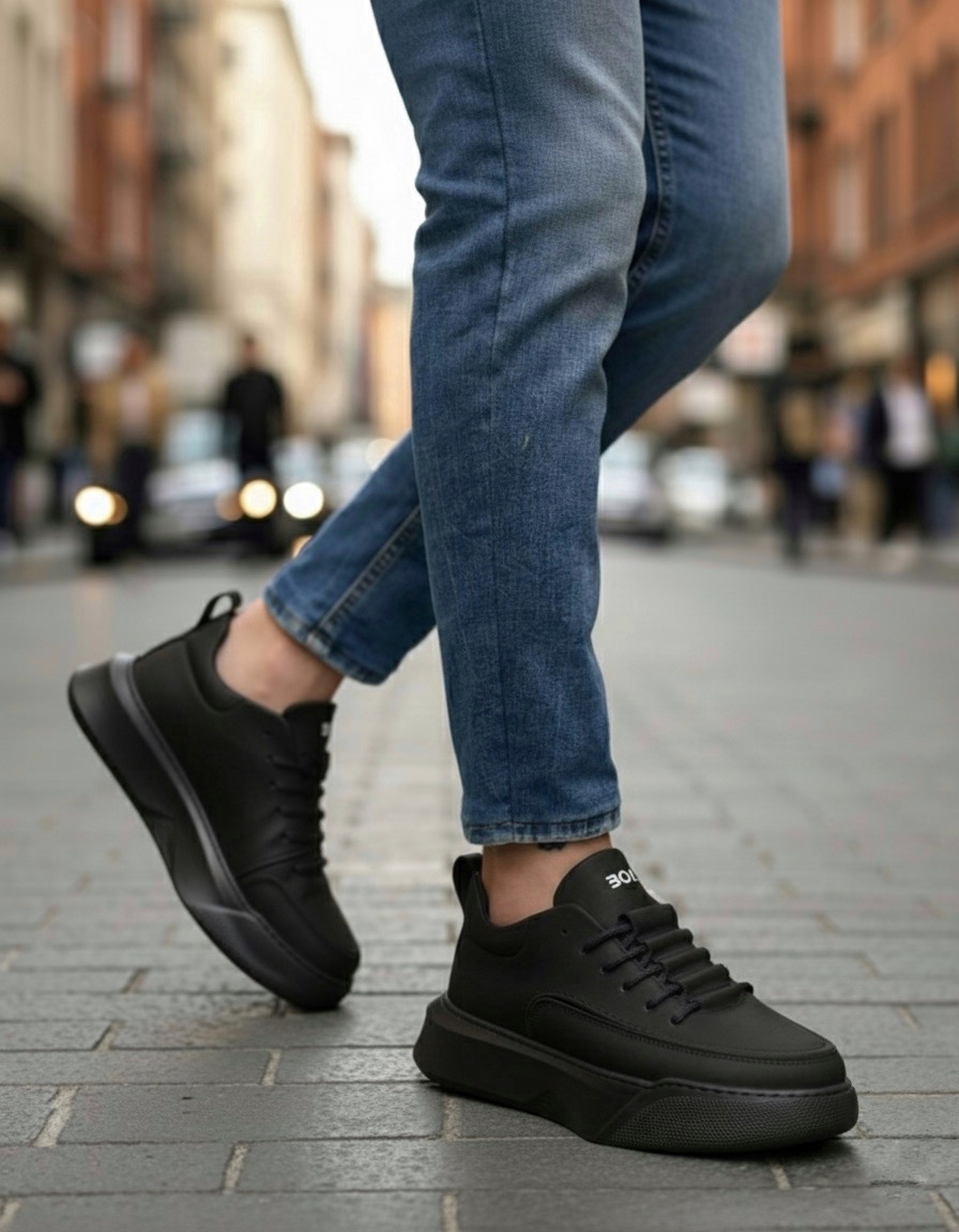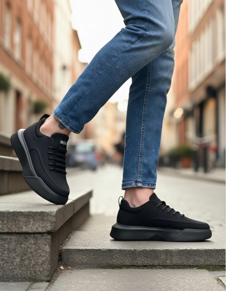 Marka BOA BA0332 Merdiven Desen Bağcıklı Erkek Yüksek Taban Siyah Cilt Siyah Taban Spor Ayakkabı