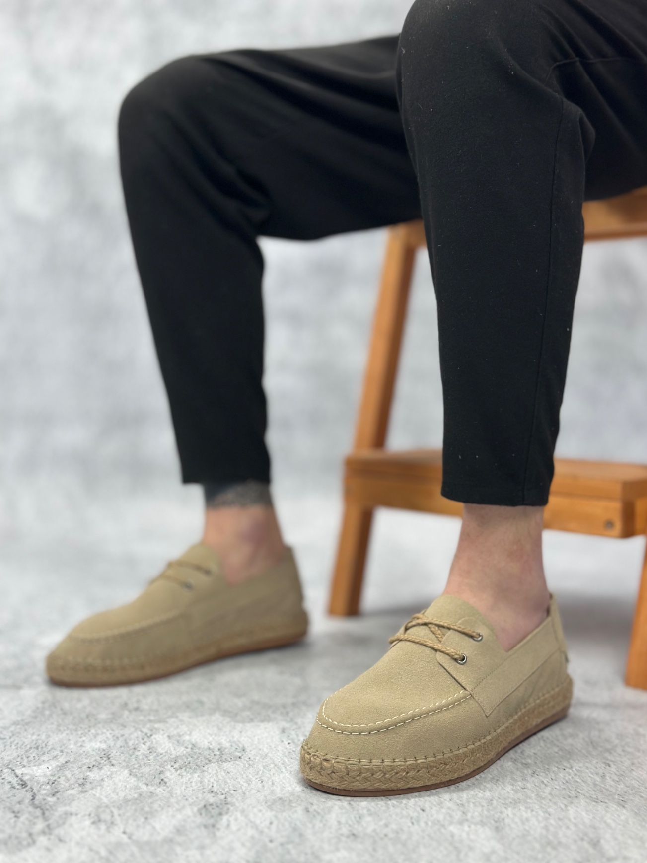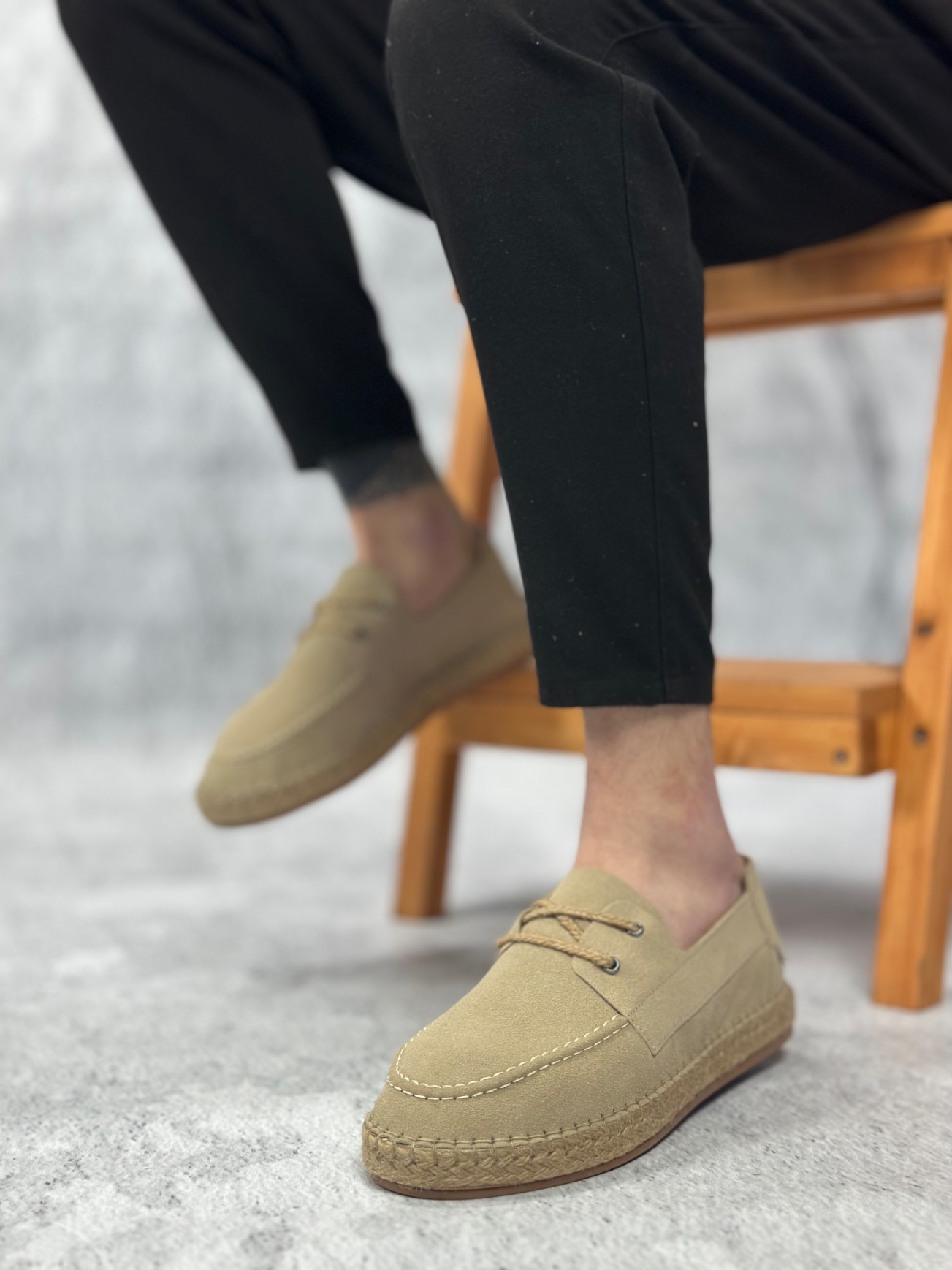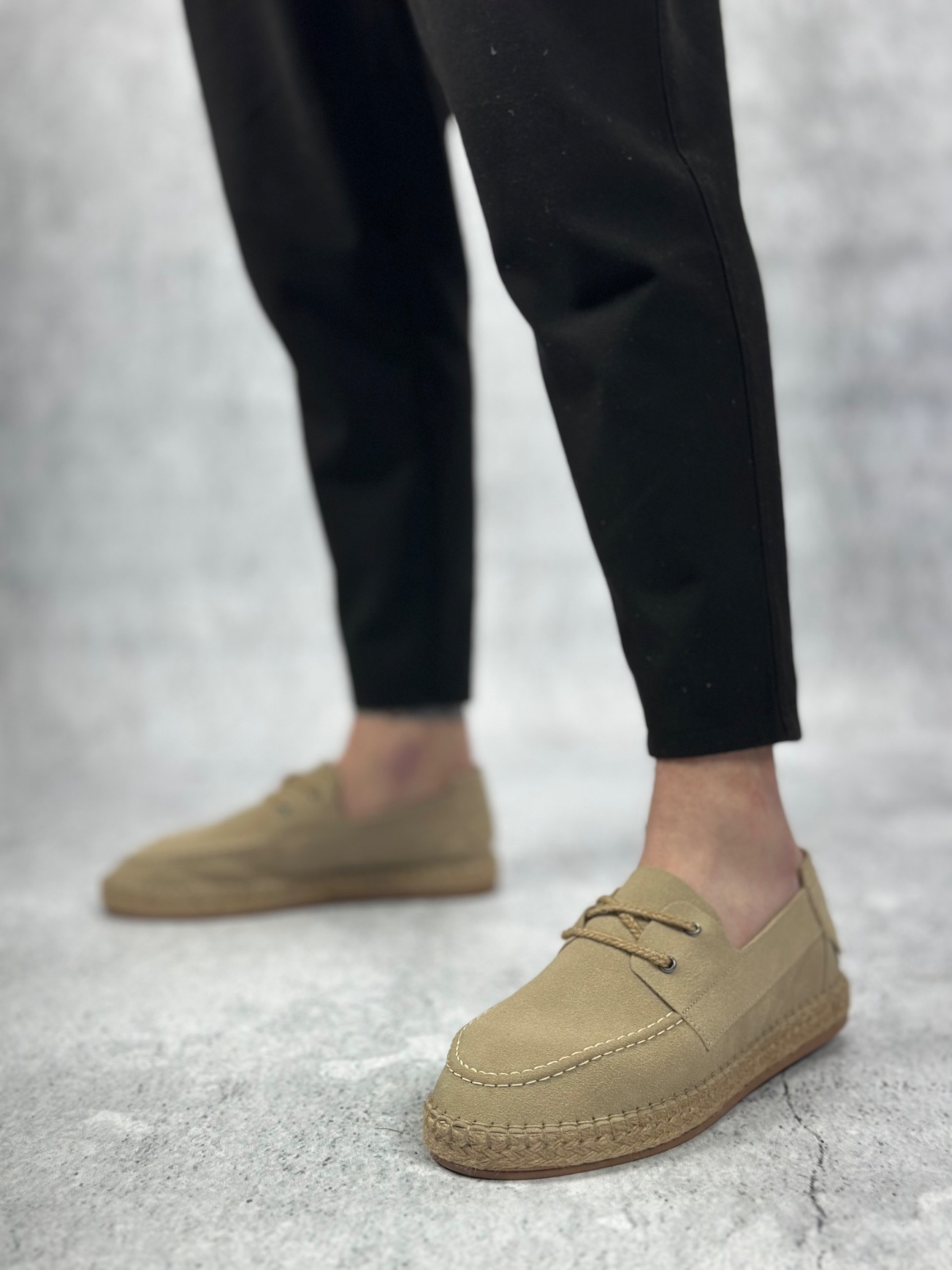 BA0358 BOA Doğal Deri Tozu Bağcıklı Kauçuk El Yapımı Espadril Taban Bej Renk Erkek Ayakkabı