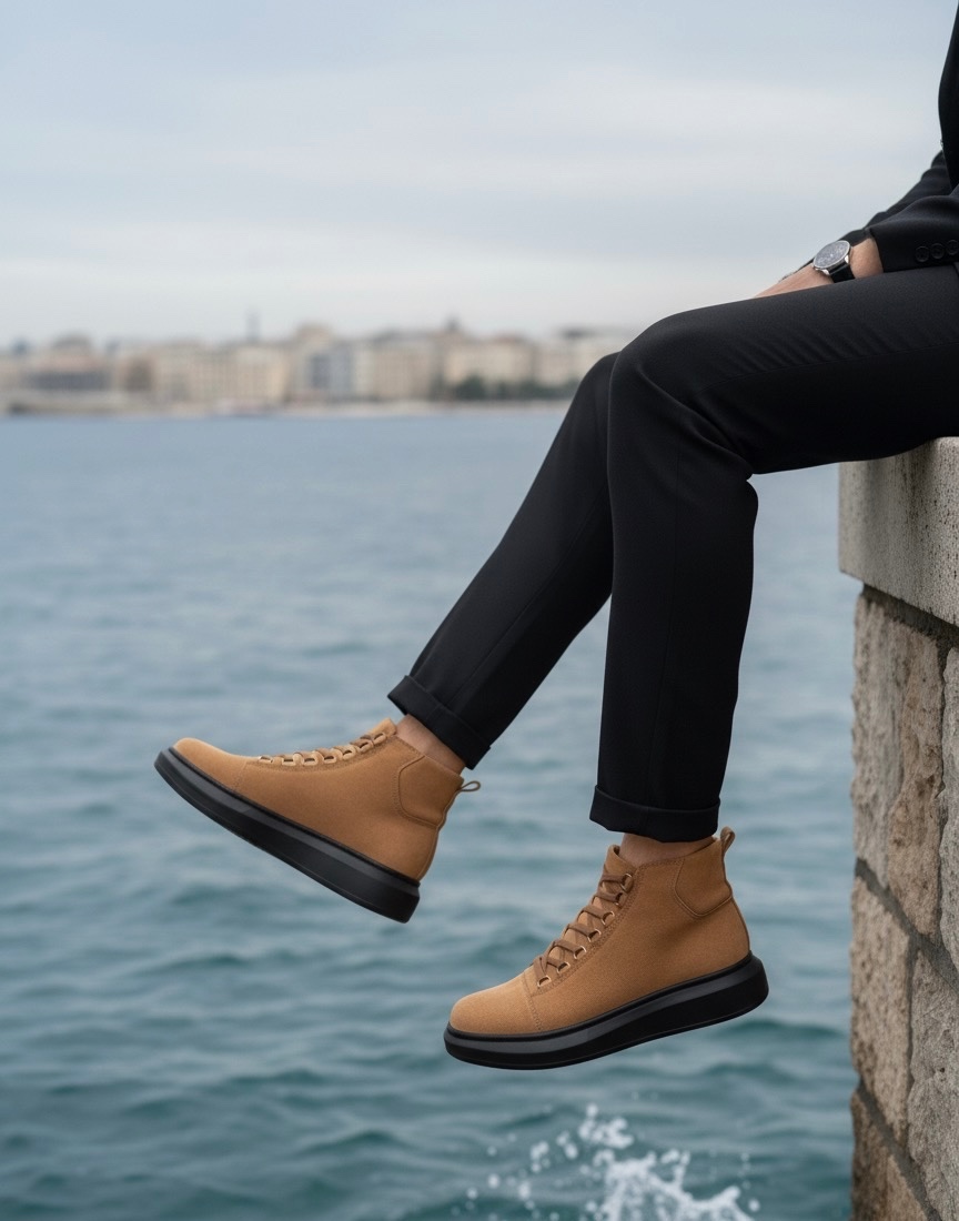 BA0713 Bağcıklı Yüksek Taba Süet Siyah Taban Erkek Tarz Spor Bot