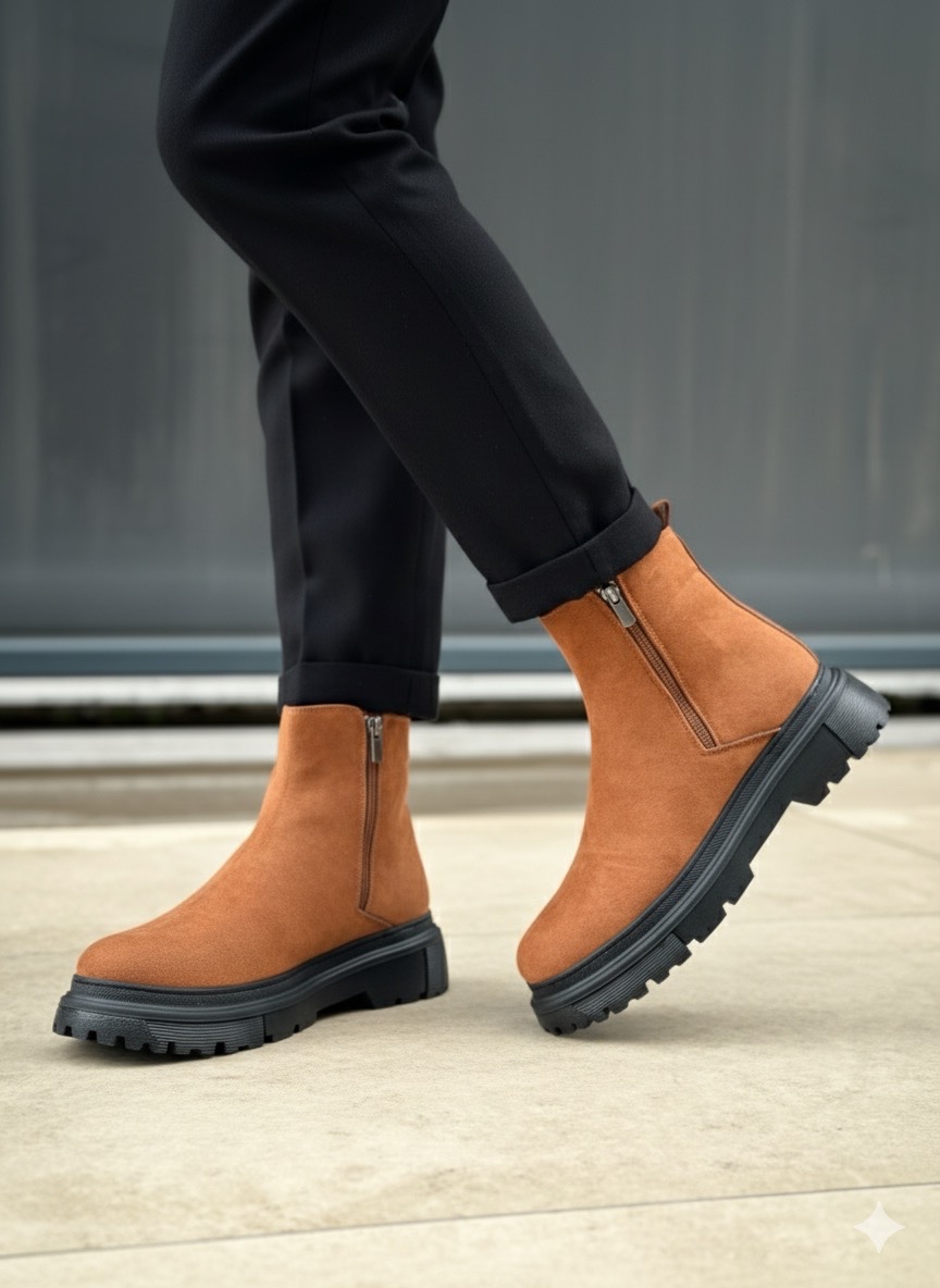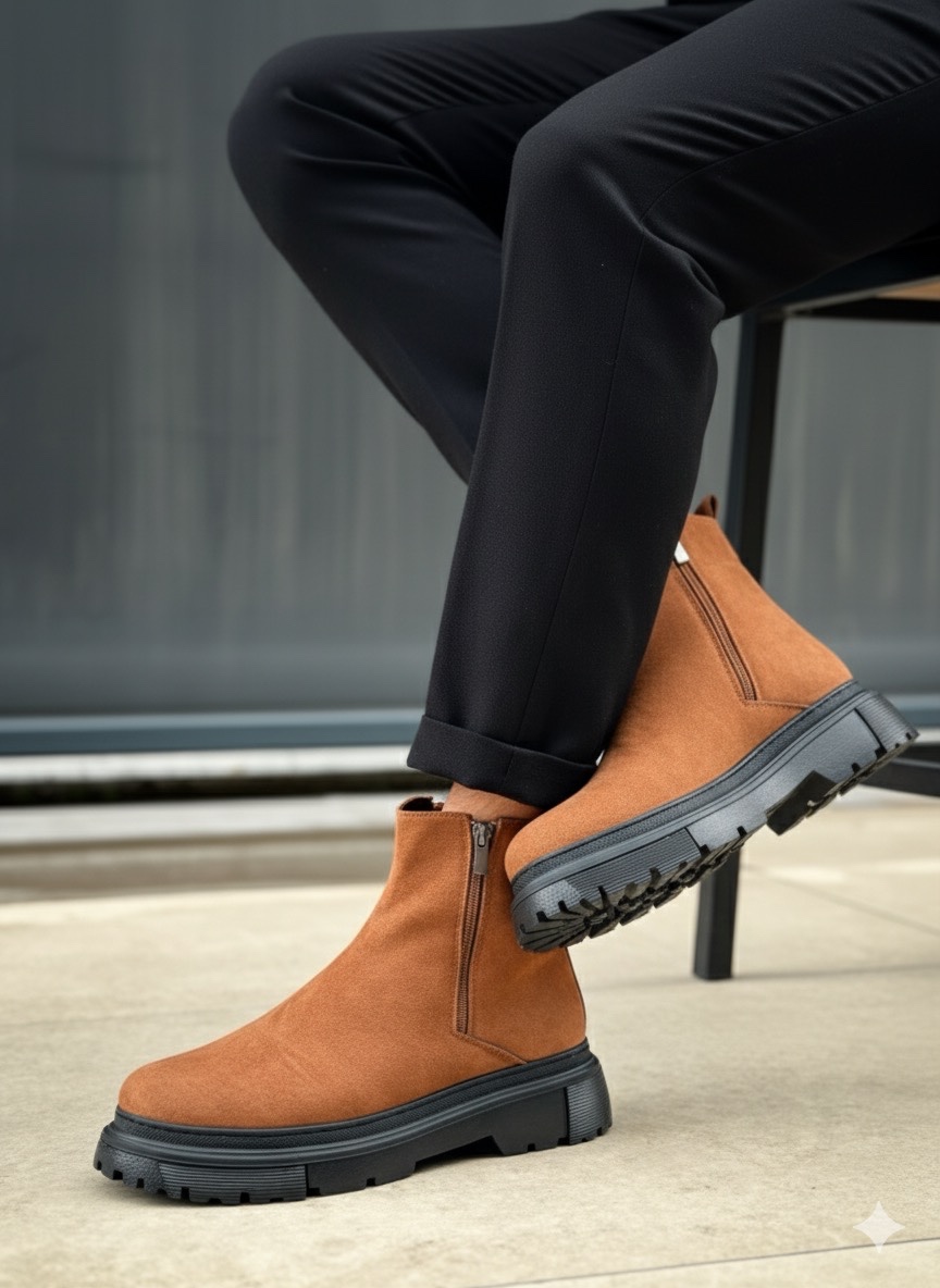 • BA0777 Süet Taba Siyah Taban Çift Fermuarlı Erkek Yarım Bilek Bot