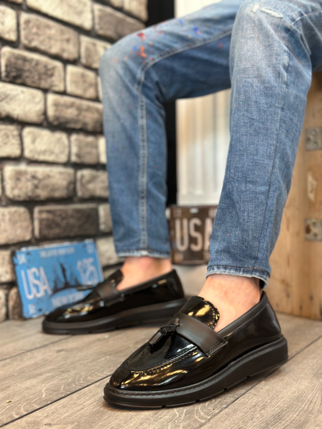 • BA0005 Bağcıksız Yüksek Siyah Taban Klasik Rugan Püsküllü Corcik Erkek Ayakkabı