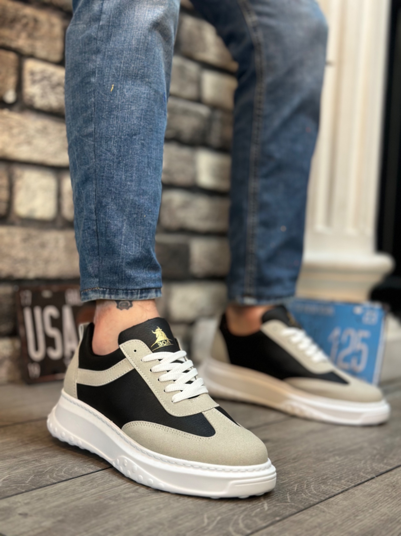 • BA0327 BOA Kalın Yüksek Taban Gri Siyah Bağcıklı Spor Erkek Ayakkabı